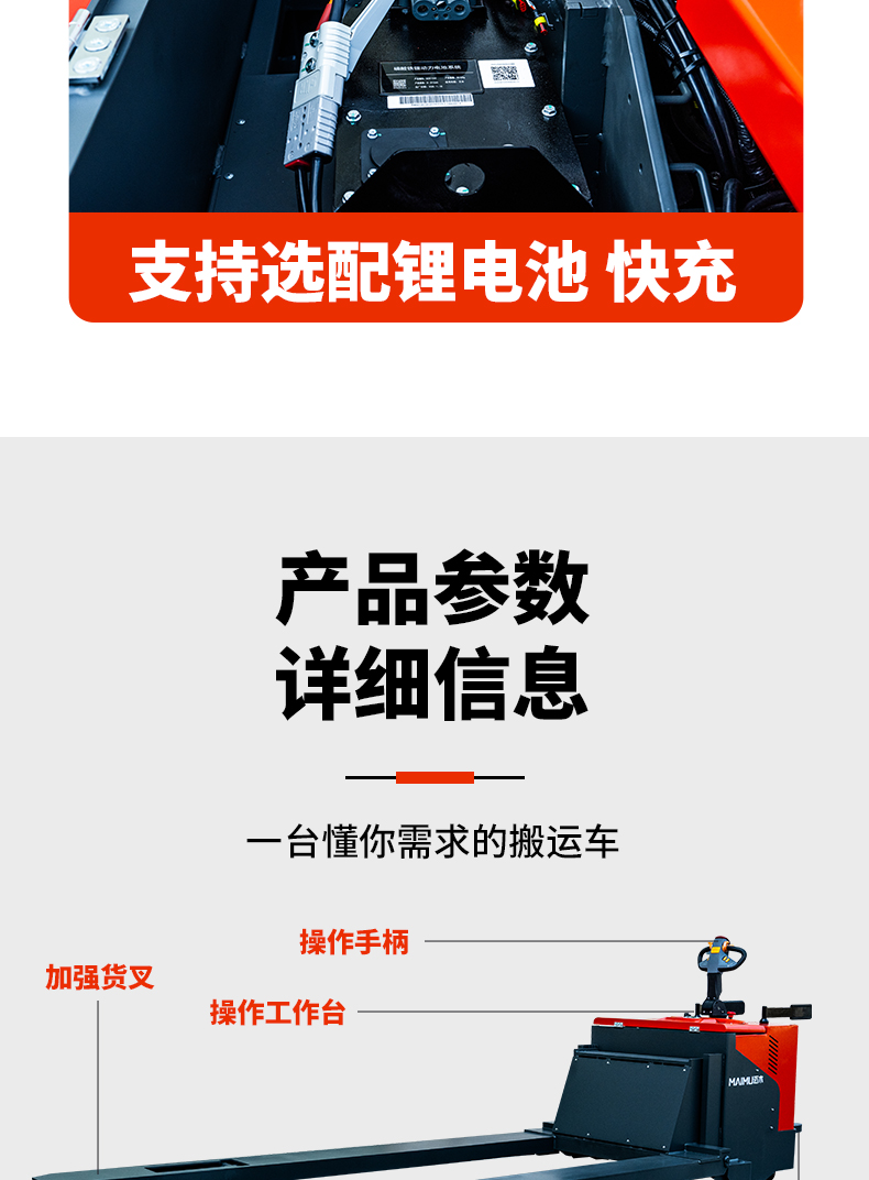 1.产品型号:M80C-M100C(电子助力转向) 2.额定载重:8T-10T-12T-15T-20T 3.电机功率:48V/6KW(8T) 4.电机功率:48V/8KW(10T) 5.蓄电池容量:(8T)48V/120AH(支持选配锂电池) 6.蓄电池容量:(10-12T)48V/165AH(支持选配锂电池) 7.支持非标定制加长加宽,定制电缆线盘V形货叉 8.详细技术参数咨询客服
